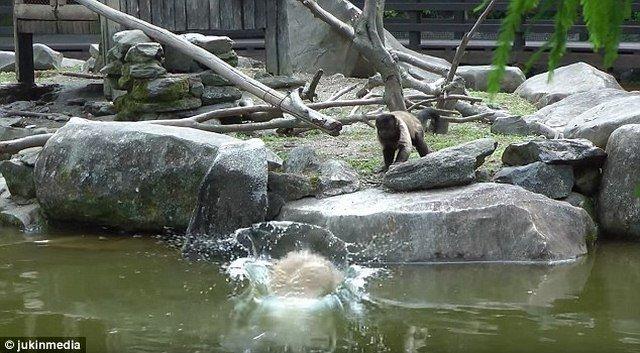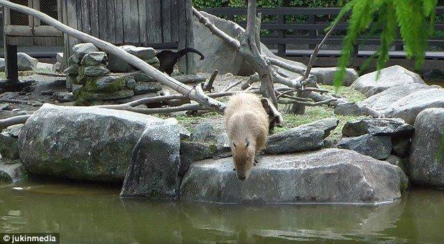 Sau mấy giây chạy thoát bầy khỉ, “Bơ Sữa” đứng ở một mỏm đá, bên cạnh là cái ao. Khi đang nhìn dòng nước chảy, “Bơ Sữa” không cảnh giác và một con khỉ mũ đã lẻn ra phía sau, huých nhẹ vào mông chuột lang khổng lồ. Mất đà, chú chuột rơi tòm xuống nước và con khỉ cũng biến mất ngay sau đó.