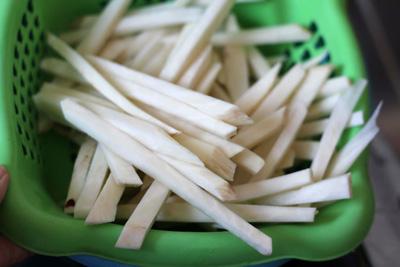 - Khoai lang gọt bỏ vỏ, cắt khúc dài rửa sạch để ráo.