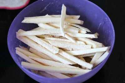 - Bắc chảo lên bếp, dầu nóng cho khoai vào chiên giòn.