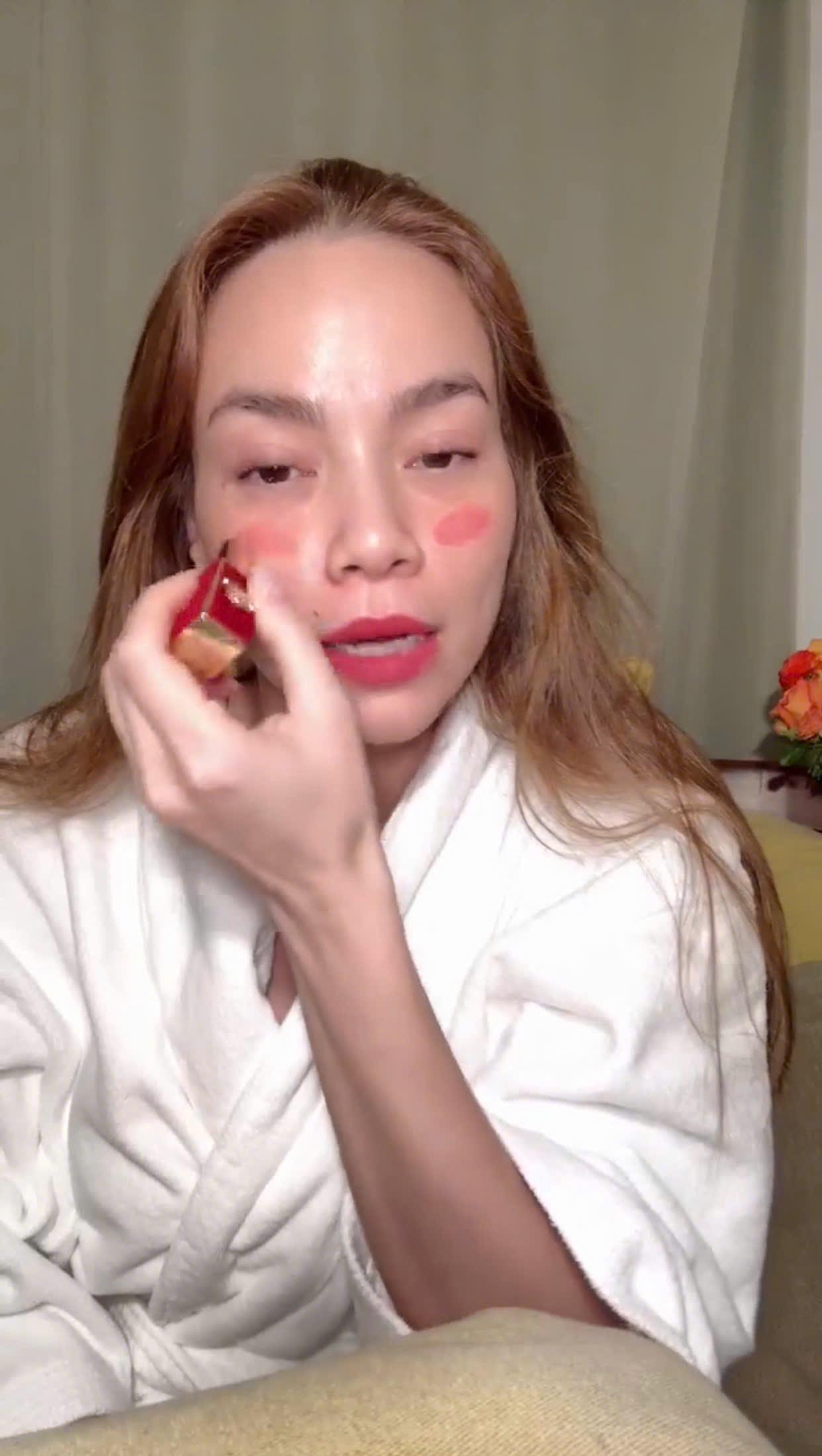 Nhìn hình ảnh của mình khi chưa trang điểm, chỉ tô son, nữ hoàng giải trí "lỡ miệng" thốt lên: "Trời ơi, một cái mặt chưa trang điểm, nhìn gớm quá!". Được biết, Hà Hồ vừa bị mất đồ trang điểm và đau bụng nên thần sắc có phần nhợt nhạt.Ngay lập tức, bà mẹ 3 con phải "chữa cháy" bằng cách dùng thỏi son sẵn có, thoa lên má và mắt thay phấn trang điểm cho tươi tắn Trước đó, giao diện của Hà Hồ từng là tâm điểm "mổ xẻ" của CĐM khi để mặt mộc lên vùng cao làm thiện nguyện. Nhiều người cho rằng, dù chăm da kĩ càng nhưng Hồ Ngọc Hà không tránh khỏi dấu hiệu xuống sắc khi sắp chạm ngưỡng 40 tuổi. Cô cũng gặp tình trạng lỗ chân lông to, da thiếu săn chắc, các vùng như rãnh cười cũng khá rõ khi cử động miệng. Tuy nhiên, "nữ hoàng giải trí" vẫn được hội chị em lên tiếng bảo vệ vì cô đã trải qua nhiều lần sinh, tuổi cũng đã 38 gần 40. Dù có phần kém tươi tắn nhưng làn da người đẹp vẫn láng mịn, trắng trẻo đáng ghen tị. Khối người ao ước có được làn da "già" như Hồ Ngọc Hà.Ở ngưỡng tuổi như hiện tại để đòi hỏi Hồ Ngọc Hà phải có một làn da căng mịn như tuổi 18 - 20 dường như là chuyện khá hi hữu. Việc giữ được độ trắng sáng, đều màu như hiện tại đã vô cùng khó khăn, đòi hỏi Hồ Ngọc Hà phải theo một routine chăm sóc kỹ lưỡng.Ngoài thói quen skincare tại nhà, vào những dịp cuối tuần, cô thường xuyên đi tắm trắng, chăm sóc da để giữ gìn làn da trắng sáng, trẻ đẹp.Nhìn chung, mặt mộc của bà mẹ 3 con vẫn rất đáng ngưỡng mộ so với hội chị em ở cùng độ tuổi.Những điểm trừ hiếm hoi khi để mặt mộc không làm Hồ Ngọc Hà trông quá khác biệt khi rời xa lớp trang điểm kỹ càng.Thường ngày, Hồ Ngọc Hà trang điểm nhẹ nhàng, khoe làn da căng bóng. Còn khi cần xuất hiện chỉn chu tại gameshow hoặc các sự kiện lớn, mỹ nhân 8X vẫn khiến dân tình mê mệt vì nhan sắc ấn tượng.Layout son môi đỏ này đã trở thành huyền thoại được nhiều diễn đàn đăng tải với lời khen mĩ miều.
