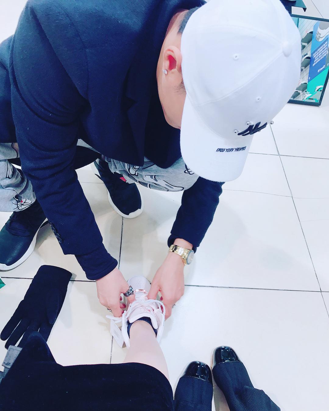 Lâm Vinh Hải tận tình buộc dây giày cho cô bạn.