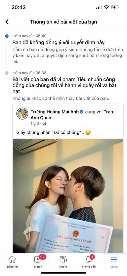 "Ủa mình up ảnh giấy chứng nhận 'đã có chồng' mà bị xóa vì lí do bắt nạt, vi phạm tiêu chuẩn cộng đồng. Thật khó hiểu", Mai Anh hoang mang.