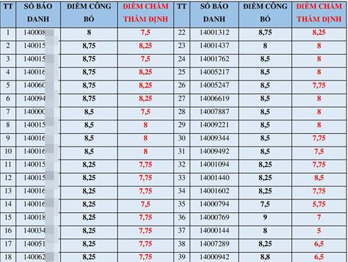 Kết quả chấm thẩm định cho thấy có 12 bài thi có điểm thấp hơn so với chấm lần đầu từ 1 điểm trở lên, trong đó có 1 bài có điểm thấp hơn 4,5 điểm so với chấm lần đầu.