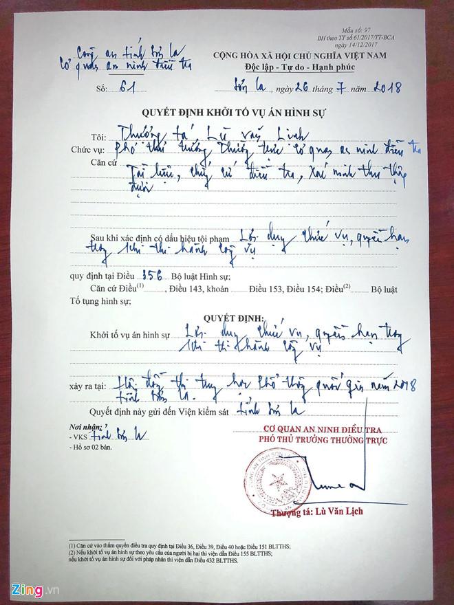 Chiều 26/7, thượng tá Lù Văn Lịch, Phó thủ trưởng Cơ quan An ninh điều tra Công an tỉnh Sơn La, đã ký quyết định khởi tố vụ án Lợi dụng chức vụ, quyền hạn trong khi thi hành công vụ (quy định tại Điều 356 Bộ luật hình sự) để điều tra về việc nhiều bài thi tốt nghiệp THPT ở Sơn La có dấu hiệu bị sửa điểm.