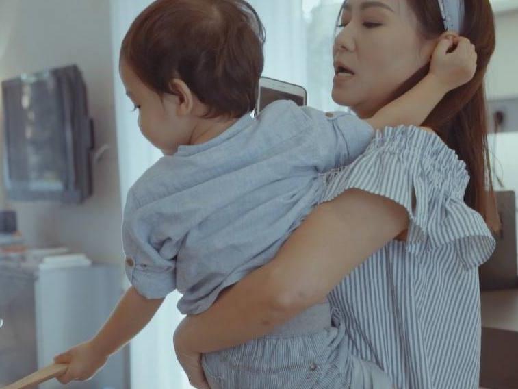 Mở đầu là hình ảnh Thu Minh làm bà mẹ bỉm sữa bận rộn. Nhưng ai tinh mắt sẽ thấy set đồ trẻ trung đúng mốt của nữ danh ca. Cô mặc váy màu xanh kẻ sọc phối với băng đô tiệp màu. Hai mẹ con ở nhà nhưng vẫn rất sành điệu.