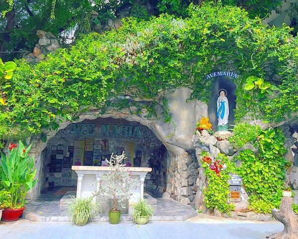 Nhà thờ có các vòng cửa hình quả trám. Cửa nhà thờ được lắp khung kính có mô tả các sự kiện tiêu biểu trong Kinh Thánh. Phía bên trong nhà thờ, nội thất tuy đơn giản nhưng lại tạo sự trang nghiêm với cấu trúc mái vòm cao lồng lộng. Trên hàng cột được trạm trổ những nét hoa văn giản dị nhưng đầy tinh tế. Phía sau nhà thờ là hang đá Đức Mẹ được xây dựng theo mẫu hang đá Lourdes ở Pháp trông rất bình yên và linh thiêng.
