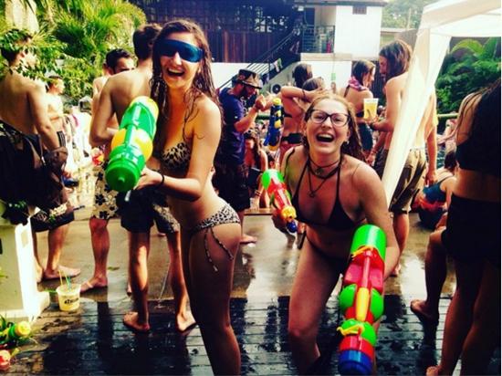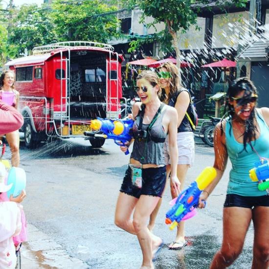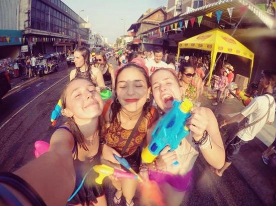 Đây là dịp rất nhiều khách du lịch đến Thái, nên chẳng mấy ngạc nhiên khi Songkran ngâp tràn các cô nàng sexy với bikini đến từ nước ngoài (@katiecrouch).Một nhóm bạn người Việt quẩy Tết Songkran siêu vui. (Ảnh: Nguyễn Thuỵ Thanh Trúc).