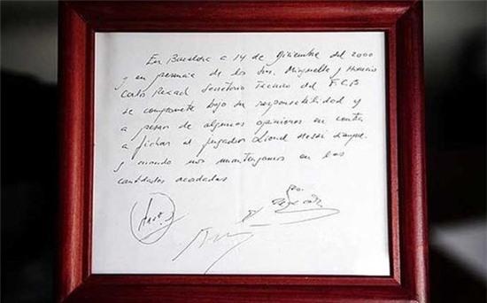 Bản hợp đồng ký trên giấy ăn của Messi.