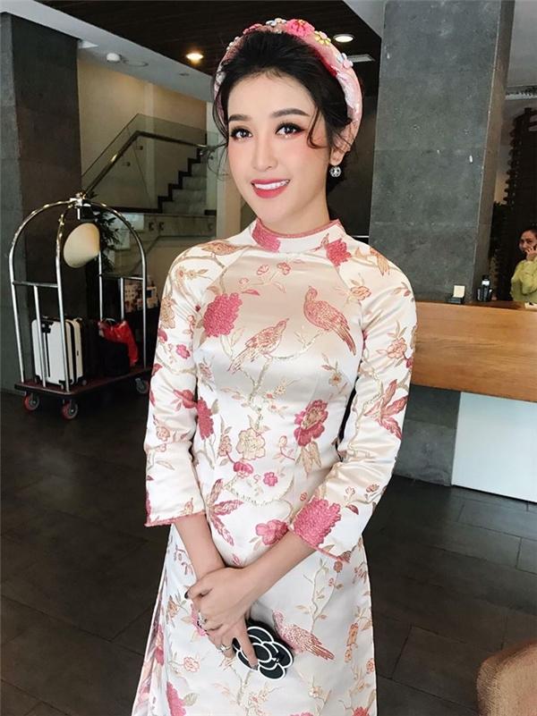 Huyền My tỏa sáng với hình ảnh quý cô cổ điển, quyền quý với chất liệu gấm cùng họa tiết thêu tay kì công.