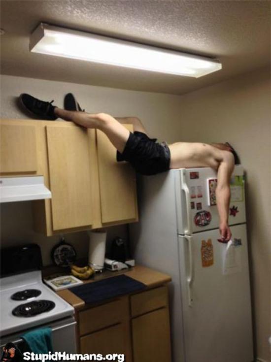 11. Tủ lạnh là giường, tủ bát là chỗ gác chân, đánh một giấc ngon lành nào.