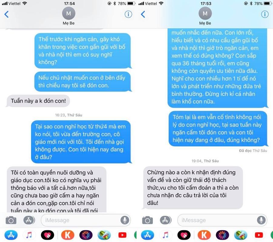 Hơn nữa tôi cũng chưa bao giờ cấm, hay ngăn cản anh đón con. Tôi chỉ nói tuần này anh không đón... Chừng nào anh còn không nhận định đúng vấn đề và còn giữ thái độ thách thức, vu khống cho tôi cấm đoán anh thì anh còn chưa nhận được câu trả lời của tôi đâu".