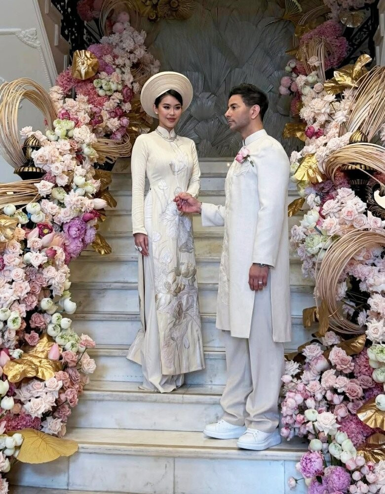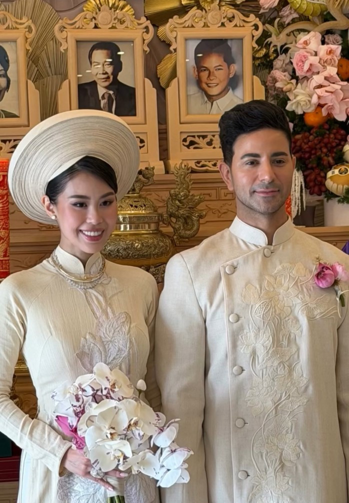 Xuất hiện trong lễ gia tiên, cô dâu - chú rể lựa chọn áo dài trắng đồng điệu. Cô dâu Tiên Nguyễn còn đội mấn khoe vẻ đẹp truyền thống. Trong khi đó, chú rể gốc Dubai được khen điển trai, lịch lãm. Cả hai được nhận xét vô cùng xứng đôi.