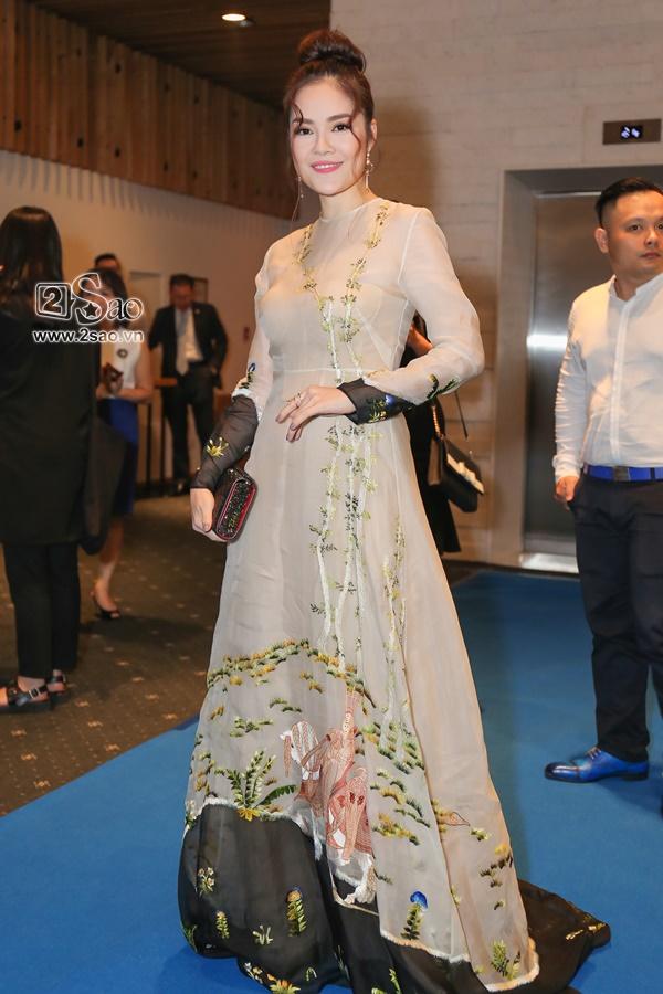 Hoàng Oanh đến sự kiện sau Huỳnh Anh. Cô diện một chiếc váy xanh ôm sát được đính kết cầu kỳ, gợi cảm