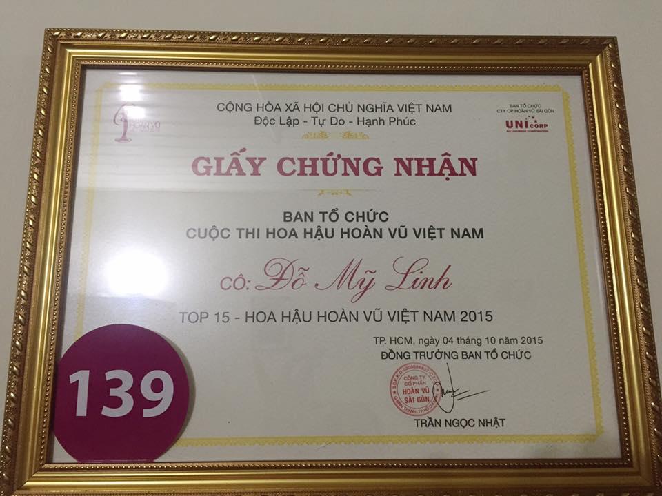 Giấy chứng nhận top 15 của Đỗ Mỹ Linh ở Hoa hậu Hoàn Vũ 2015