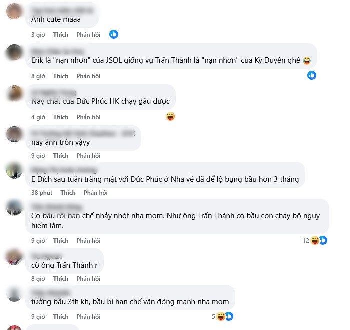 Dưới bài đăng của Jsol, rất nhiều người để lại bình luận nhắc đến Trấn Thành một cách hài hước: "Erik là nạn nhân của Jsol giống vụ Trấn Thành là nạn nhân của Kỳ Duyên", "Có bầu rồi hạn chế nhảy nhót nha như ông Trấn Thành có bầu còn đi chạy bộ nguy hiểm lắm", "Cỡ ông Trấn Thành rồi"...