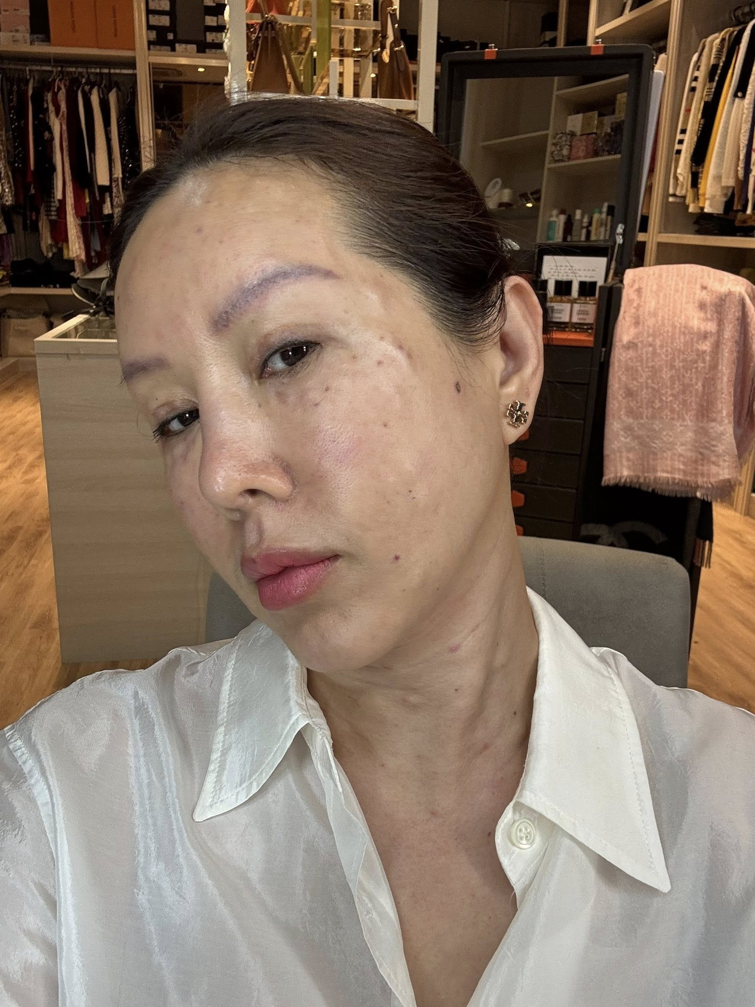 Trên trang cá nhân, Thu Hoài chia sẻ hình ảnh cận gương mặt đầy vết tích vì tiêm hàng trăm mũi tăng sinh collagen. Ngoài gương mặt trông "thấy ghê", người đẹp thừa nhận vô cùng đau đớn. "Nếu cuộc đời có quá nhiều tiêu cực thì bạn hãy thử cho tiêm mấy trăm mũi lên mặt đi, bạn sẽ không những thấy ghê mà còn đau 'thí mụ nội'", cô chia sẻ.