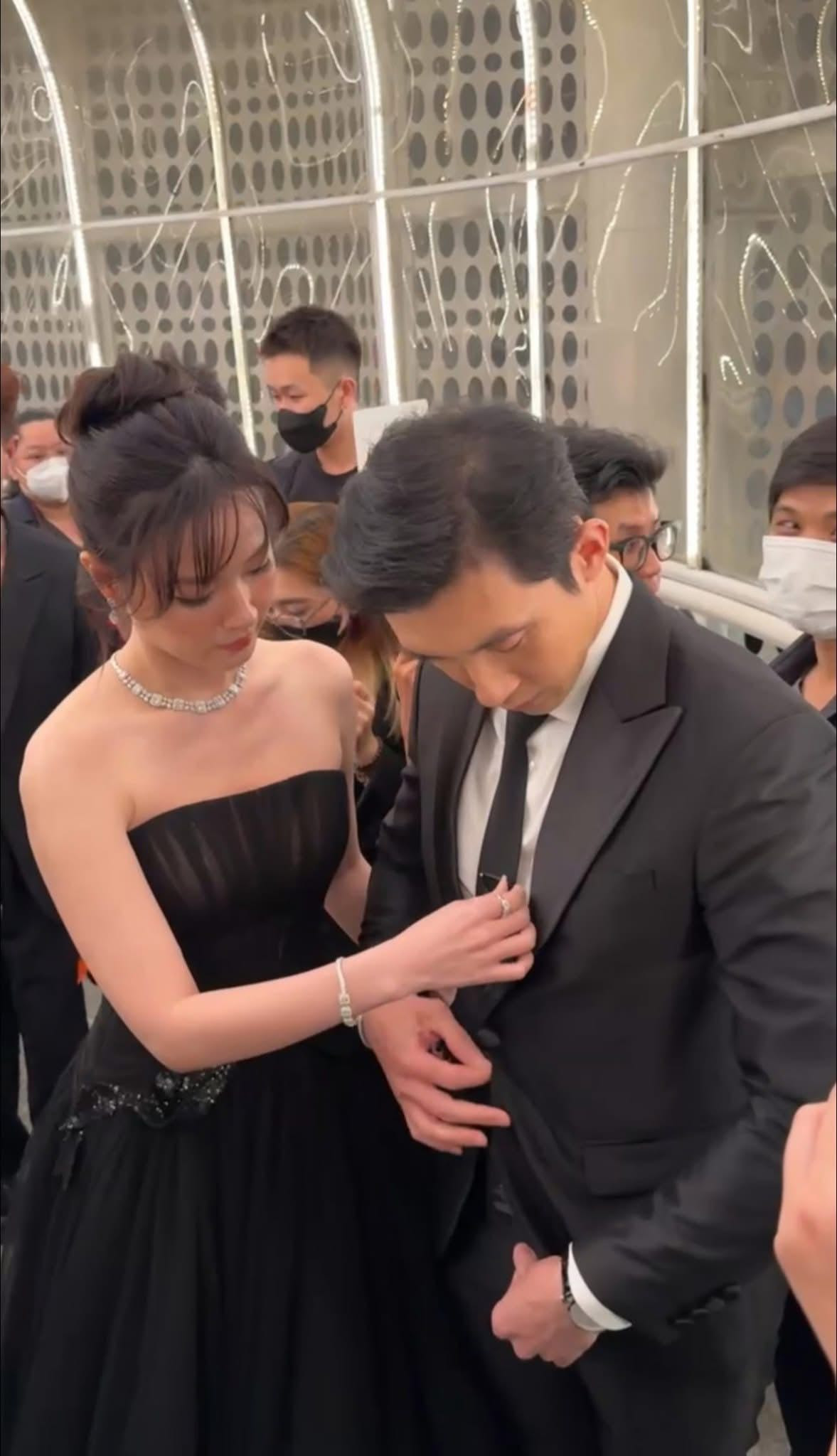 Xuất hiện trên thảm đỏ, cặp vợ chồng Midu - Minh Đạt trở thành tâm điểm chú ý. Cả hai lên đồ tông đen đồng điệu, dính như sam ở sự kiện. Cặp đôi không ngại thể hiện tình cảm, chăm chút nhau như cặp vợ chồng son.