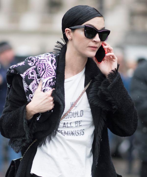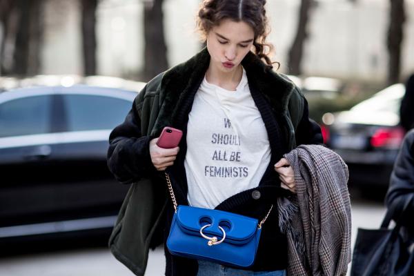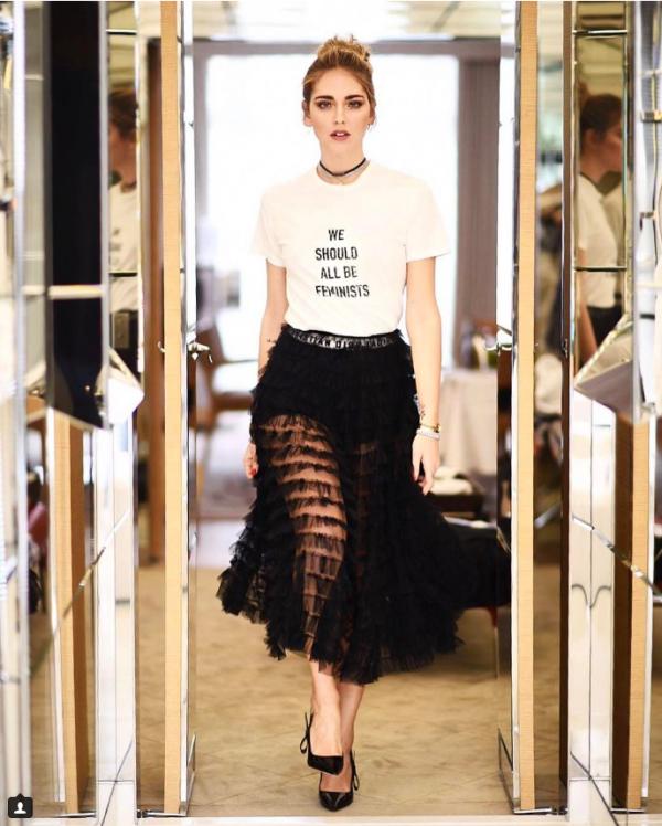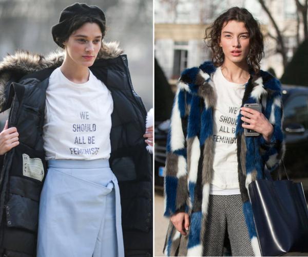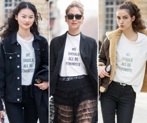 Không phải là bất cứ mẫu trang phục hay sắc màu lòe loẹt nào mà sự “phá đảo” nhẹ nhàng này lại đến từ chiếc áo thun in slogan đơn giản “We Should All Be Feminist” nhưng thể hiện giấc mơ nữ quyền của người phụ nữ trong thời hiện đại.