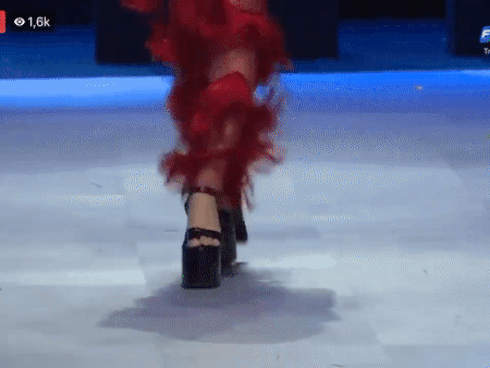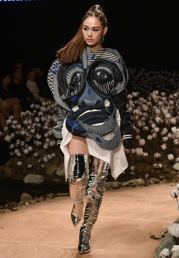 Đi giày cao tới 25 centimet nhưng cô vẫn catwalk uyển chuyển, nhịp nhàng.