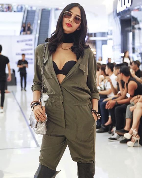khi chọn bộ jumsuit mang hơi hướng military phanh cúc lộ bra.