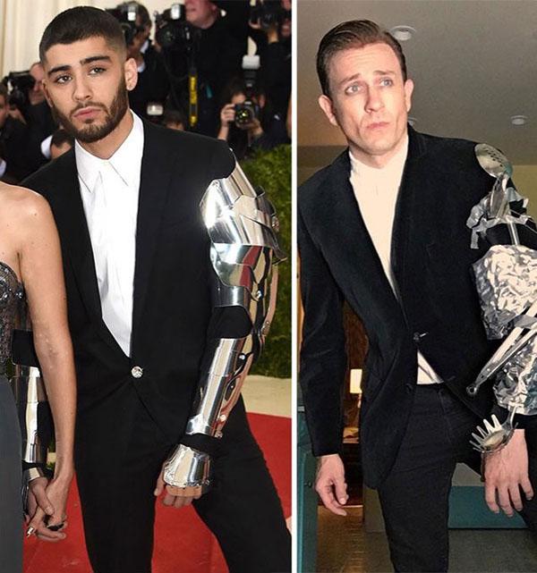 Tom Lenk trong vai Zayn Malik tại buổi Gala. Thìa,dĩa đem ra làm phụ kiện đủ cả.