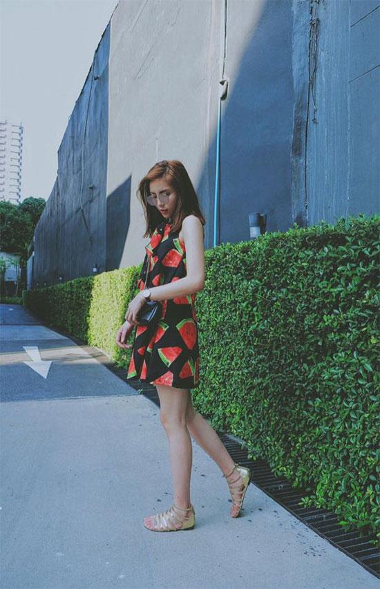 Kỳ Duyên trẻ trung với bộ đầm liền hoạ tiết miếng dưa hấu nhân dịp đi du lịch