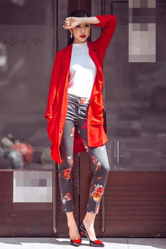 Quần skinny in hoa, áo choàng đỏ, áo thun trắng và giày cao gót là set