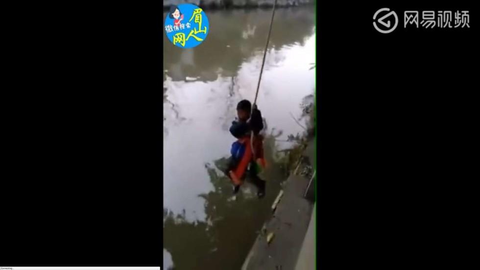 Đoạn clip cho thấy một người cha ở Mi Sơn (Tứ Xuyên, Trung Quốc) buộc con vào một sợi dây gắn trên ròng rọc cạnh bờ sông.