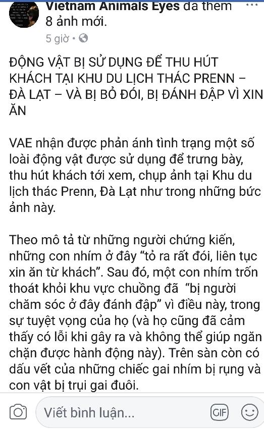 Bài viết cho biết thông tin về tình trạng này được phản ánh trên trang web TripAdvisor. Từ đó, page này kêu gọi mọi người phản ánh, yêu cầu khu du lịch thác Prenn “cải thiện chất lượng chăm sóc động vật”, “chấm dứt những hành vi ngược đãi, lạm dụng động vật”.