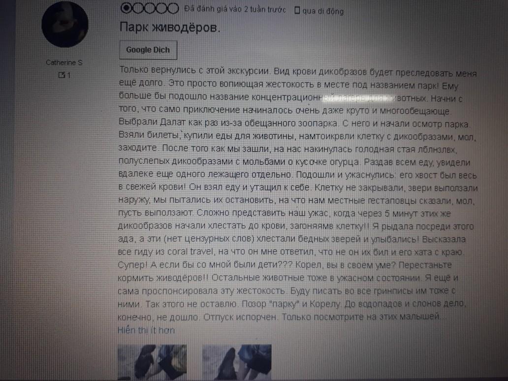 Theo tìm hiểu của PV, thông tin về sự việc được trang mạng xã hội Vietnam Animals Eyes chia sẻ là từ bình luận của người dùng Catherine S trên trang web TripAdvisor. Bình luận trên trang web du lịch nổi tiếng được viết bằng tiếng Nga. Trong đó, du khách nước ngoài đã mô tả rằng “một sự tàn ác trắng trợn ở một nơi được gọi là công viên”.