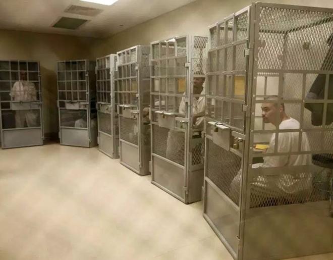 Ở một khu khác, mỗi tù nhân ngồi trong một lồng sắt riêng biệt.