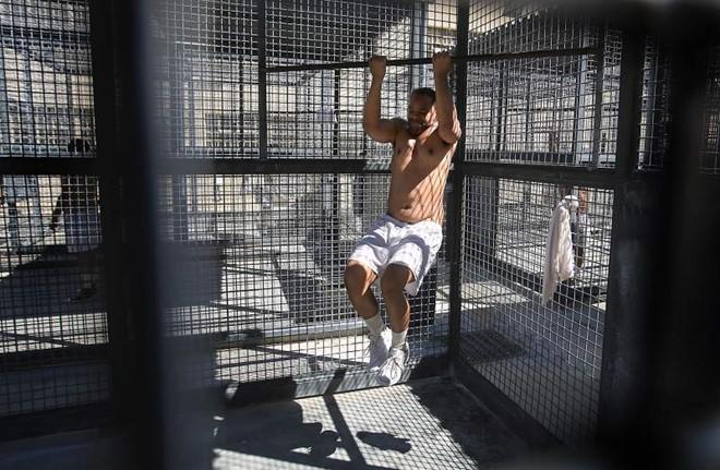 Donald Ray Debose, một tử tù, tập thể dục với xà đơn trong lồng sắt. Ông ta lĩnh án tử vì tội bắn chết một phụ nữ vào năm 1997.