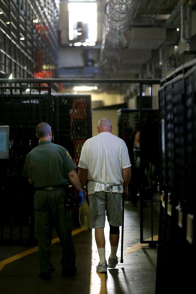 Cảnh sát đưa một tù nhân về buồng giam. Rất nhiều tên tội phạm khét tiếng đã và đang chờ chết ở San Quentin.