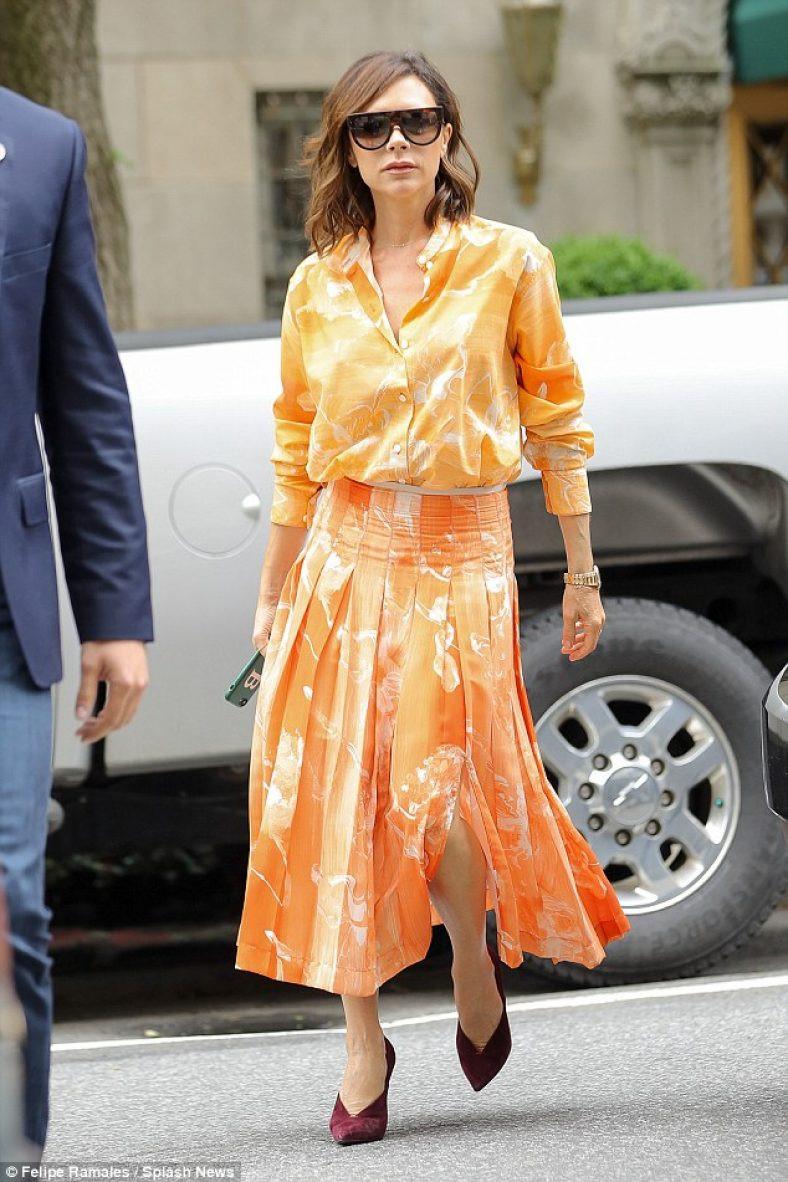 Không bao giờ sợ thử nghiệm những màu sắc mới, Victoria Beckham nổi bật với cả cây cam họa tiết in hoa sang trọng: áo sơ mi và chân váy midi.