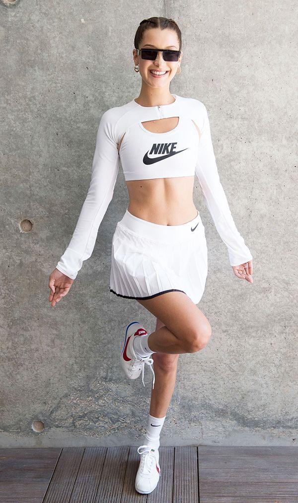 Bella Hadid khoe vòng eo săn chắc và vóc dáng thon gọn với kiểu áo bra top, chân váy mini xòe và sneaker theo phong cách thể thao năng động.