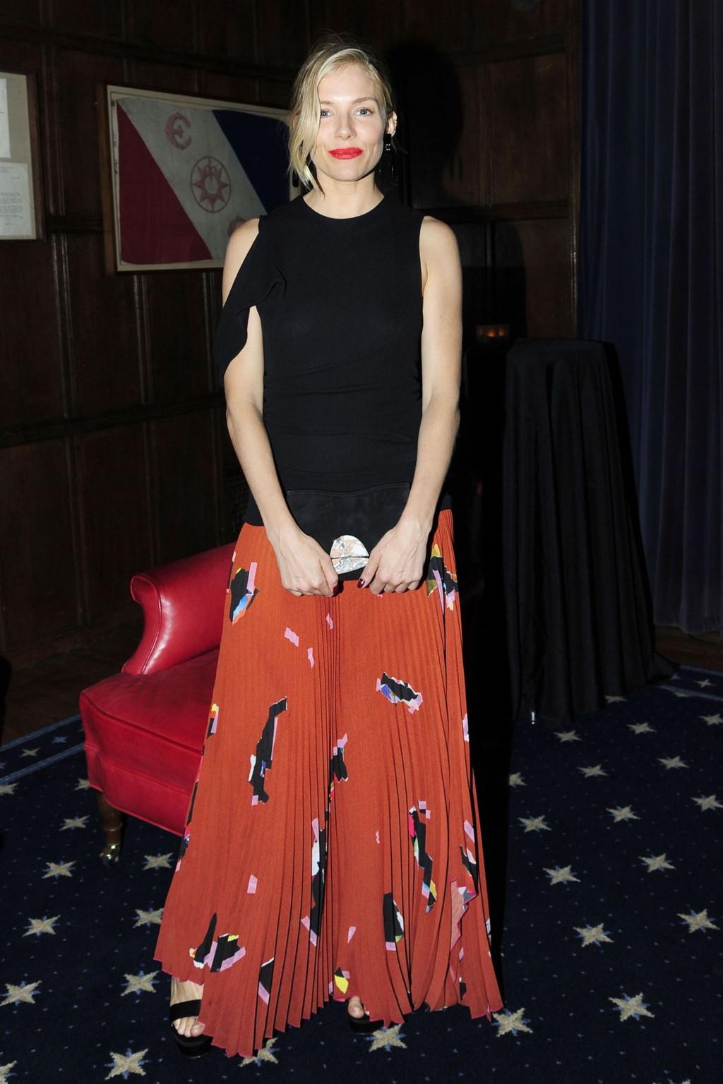 Sienna Miller chọn váy maxi xếp li in họa tiết, áo thun đen giúp tiết chế sắc cam nổi bật của chiếc váy.