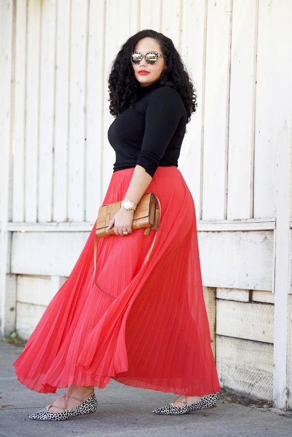 Tanesha Awasthi gợi ý cách mặc đồ cho cô nàng quá khổ với áo thun đen bó sát, chân váy maxi xếp li đỏ và giày bệt họa tiết da báo.
