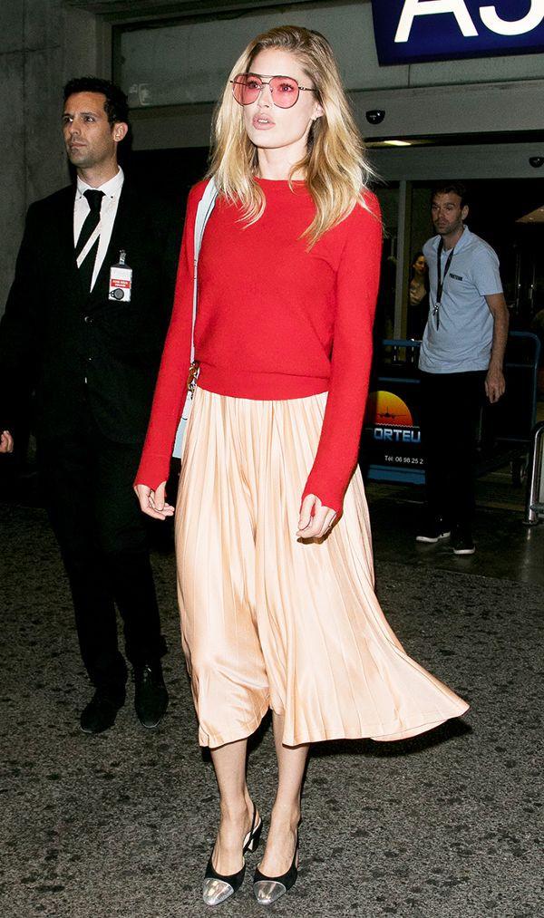 Thời trang sân bay đơn giản nhưng trẻ trung của Natalia Vodianova với áo thun dài tay, chân váy xếp li cùng tông xanh và denim jacket.