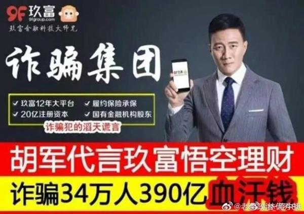Vào chiều ngày 29/7, có cư dân mạng liên tiếng tố cáo sản phẩm tài chính "Ngộ Không" của tập đoàn tài chính 9F, do Hồ Quân làm người đại diện, đã lừa đảo mình cùng với 340.000 nạn nhân khác, tổng số tiền lừa đảo lên tới 39 tỷ Nhân dân tệ (gần 135 ngàn tỷ đồng).