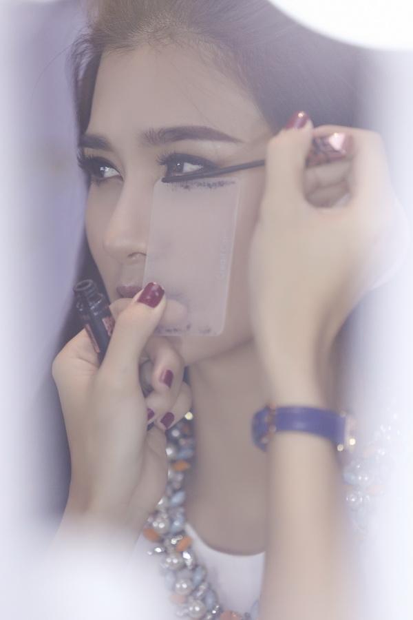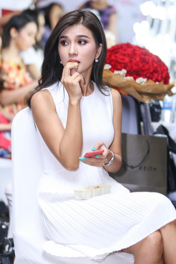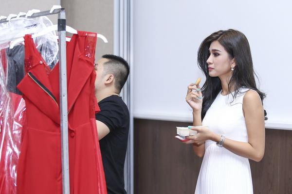 Kim Tuyến đã có mặt từ rất sớm tại hậu trường để chuẩn bị trang phục và trang điểm. Trong buổi tập, cô cũng đã được đạo diễn thời trang chỉ dẫn tận tình.