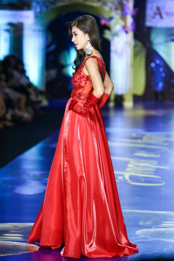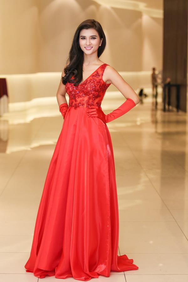 Cô nàng đã toả sáng và thu hút mọi ánh nhìn khi xuất hiện trên sân khấu với trang phục dạ hội màu đỏ có đính đá hoa phía trên.