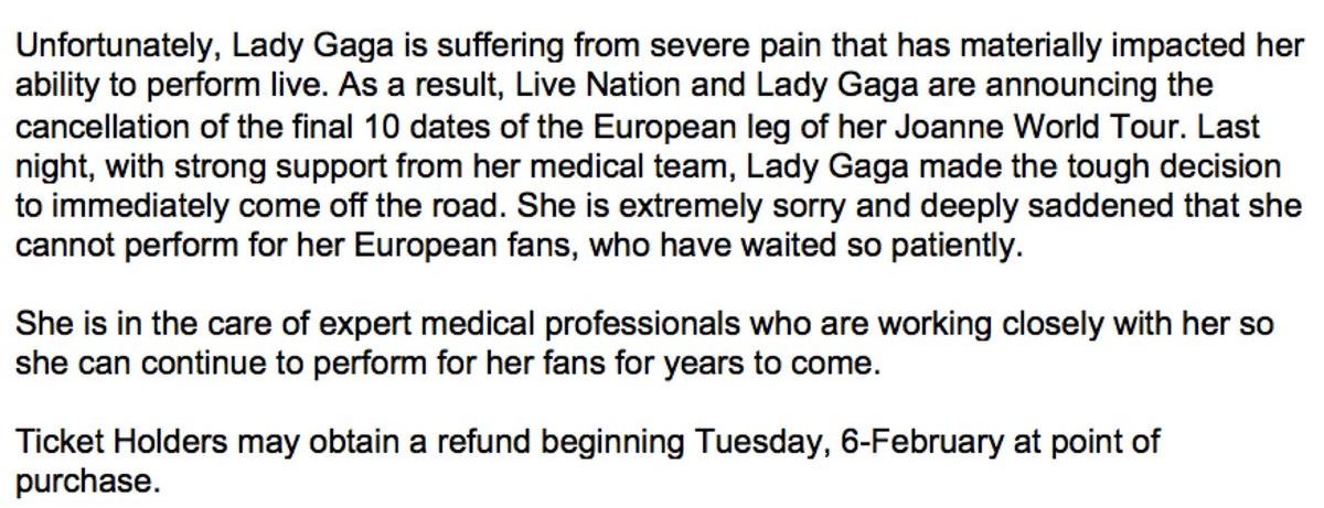 Thông báo chính thức đầy chuyên nghiệp từ phía đội ngũ của Gaga được đăng tải trên tất cả các kênh chính thức về việc huỷ những đêm diễn của Joanne World Tour.