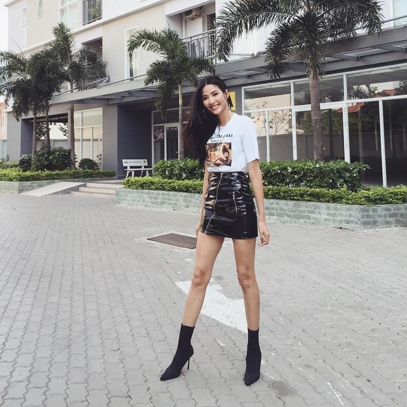Cũng với công thức tương tự, Hoàng Thùy khai thác lợi thế chân dài, dáng chuẩn với chân váy da, áo phông trắng và boots cao gót.