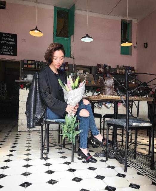 Tóc Tiên hiền hơn hẳn mọi ngày khi chỉ diện đơn thuần quần jeans và áo tay loe cách điệu. Đôi loafer hiệu Gucci đắt giá trở thành điểm nhấn thời thượng cho tổng thể set đồ của nữ ca sĩ.