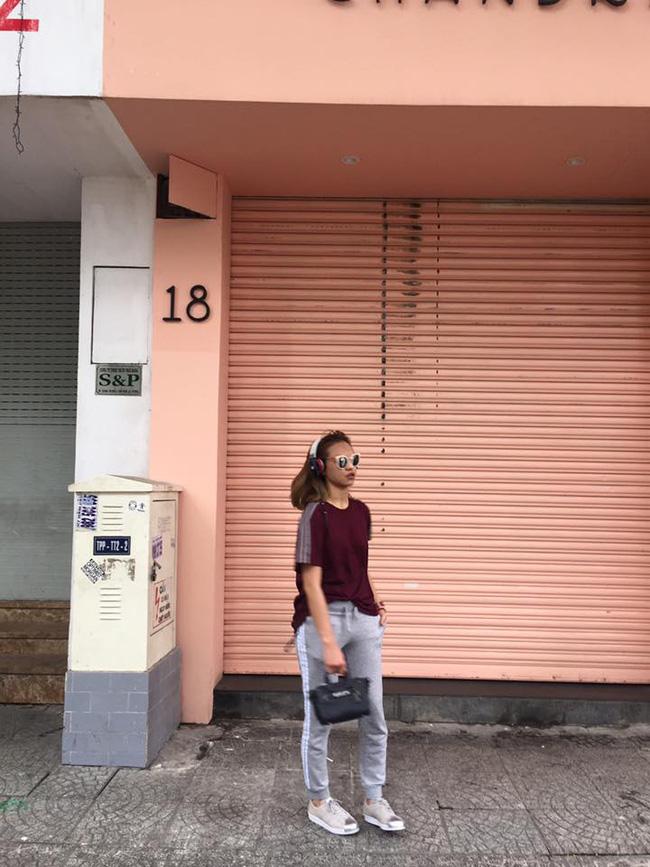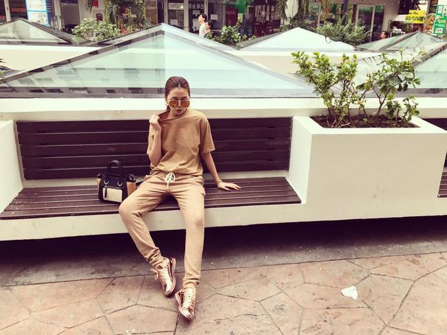 Quỳnh Mai tiếp tục ghi điểm với phong cách thể thao khoẻ khoắn khi kết hợp áo phông cùng quần nỉ và giày sneakers.