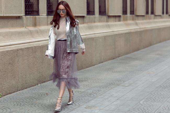 Yến Trang nổi bật trong street style sao Việt tuần này khi chọn áo jackets ánh kim lấp lánh để kết hợp cùng những món đồ xuyên thấu như chân váy và áo. Đôi cao gót ánh kim được cô nàng khéo chọn để hợp gu cùng với thiết kế áo khoác đang mặc.