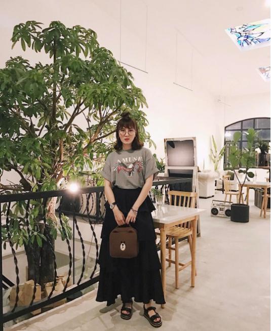 Yến Nhi lại hiền lành và dịu dàng hơn khi chỉ kết hợp chân váy xếp tầng cùng áo phông in hình độc đáo. Set đồ của cô nàng nghộ nghĩnh hơn nhờ thiết kế túi xách nhỏ xinh.