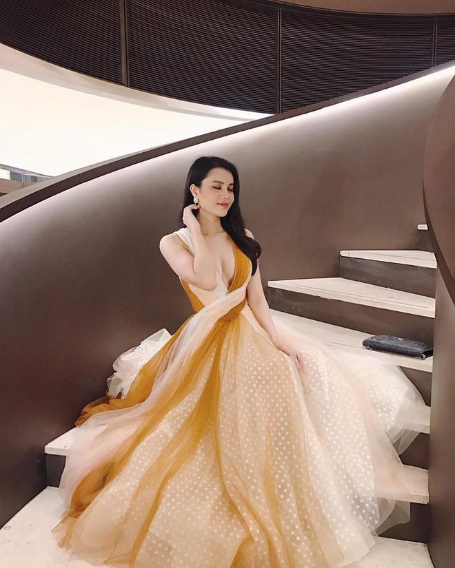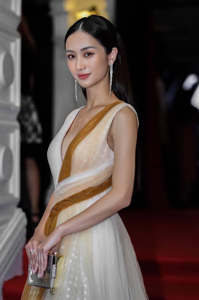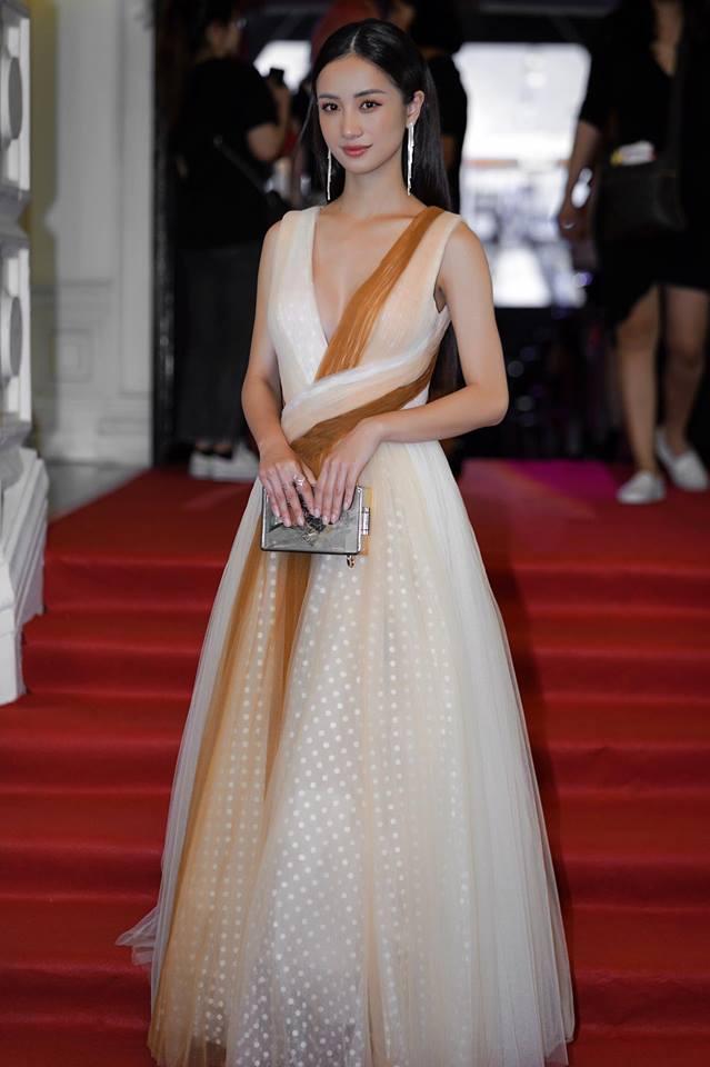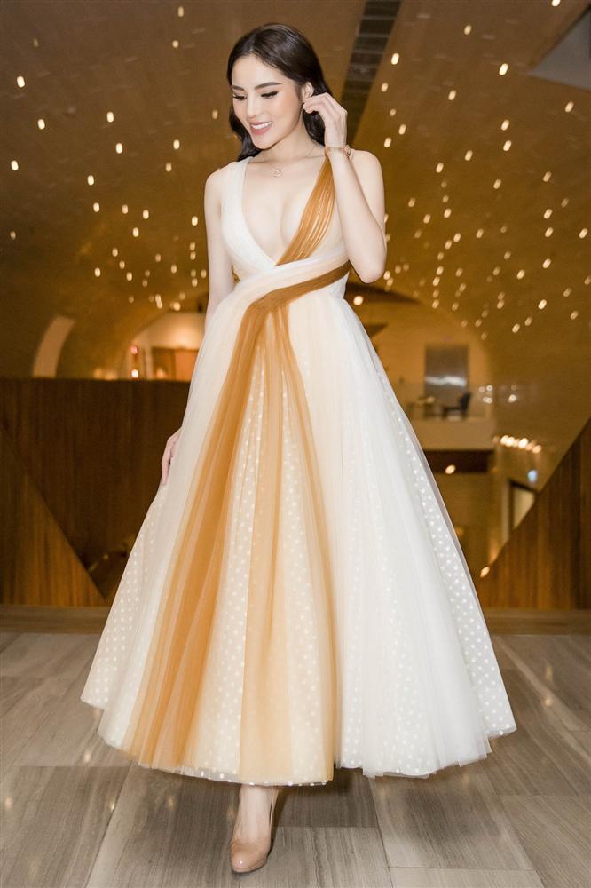 Một chiếc đầm nhưng hai mục đích: phần váy voan xòe khiến Kỳ Duyên xinh như công chúa còn phần cổ rộng lại giúp cô khoe được vòng 1 với số đo cực khủng.