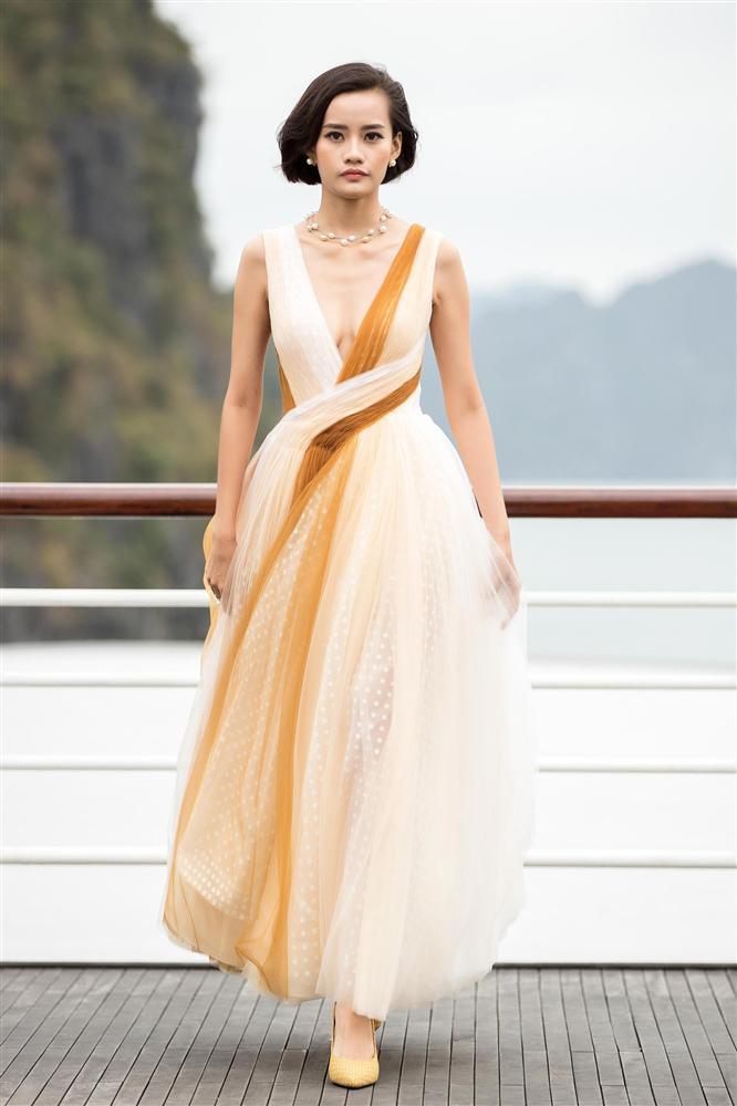 Người mẫu Kim Chi cũng từng diện chiếc đầm này trong ngày ra mắt bộ sưu tập The Oriental Sun (Mặt trời phương Đông) của Lê Thanh Hòa hồi tháng 4/2018. Xét cả 4 người thì Kim Chi lép vế nhất về số đo vòng 1 nhưng bù lại chiếc đầm lại tôn lên sự thanh thoát của người mặc.
