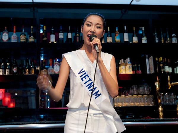 Thúy Vân tự tin thể hiện ca khúc tự sáng tác tại Miss Internaional 2015.